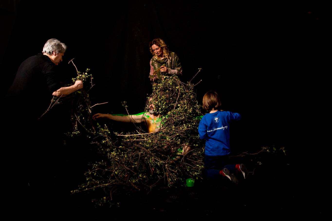 Una vez sentado, los padres y el público asistente han empezado a pintarle y a crear un bosque alrededor de él al ritmo de la BSO de La Misión compuesta por Ennio Morricone. Sin prisas han terminado su cometido y se han sentado alrededor de “la naturaleza”. Al mismo tiempo ha empezado a sonar el bosque: aves nocturnas, insectos, un río lejano… Y ha hablado Luis Miguel: